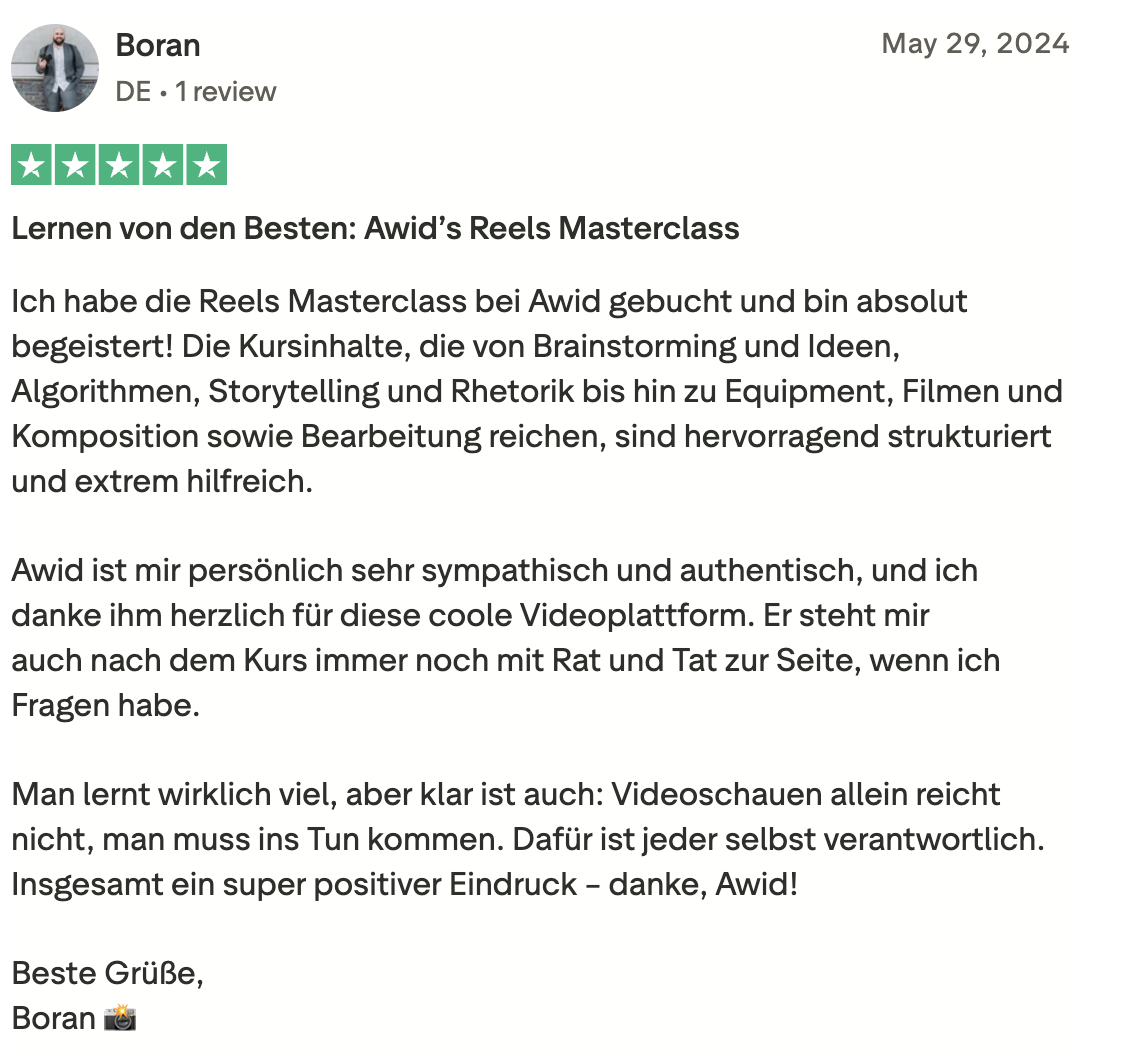 • Der Unterschied liegt in der Struktur und Praxisnähe: Statt verstreuter Tipps bekommst du einen klaren Fahrplan, echte Szenarien und transparent erklärte Einstellungen direkt an der Kamera. So lernst du in 2 Stunden mehr, als in unzähligen YouTube-Videos.